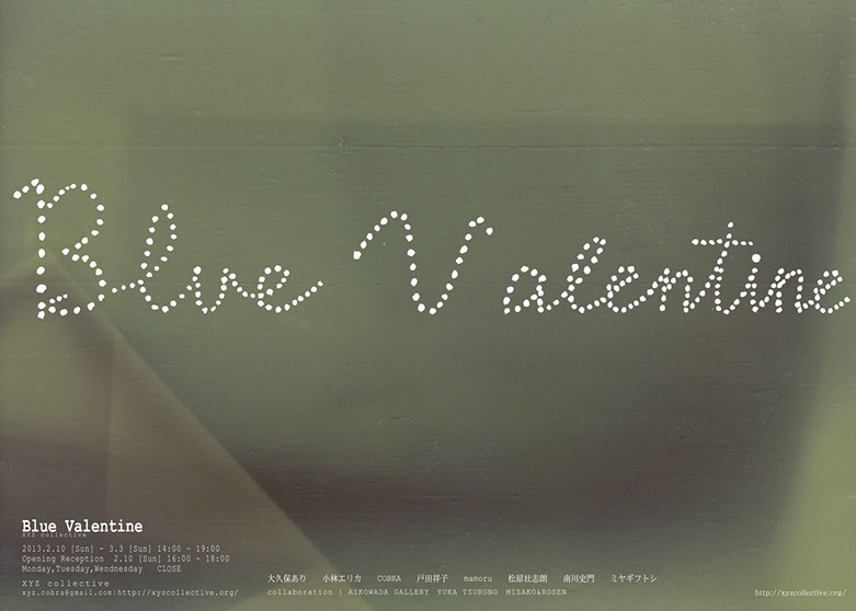 Blue Valentine 10.2.2013-3.3.2012 Artist: Ari Ookubo Erika Kobayashi COBRA Syoko Toda mamoru Soshiro Matsubara Shimon Minamikawa Futoshi Miyagi www.fmiyagi.tumblr.com curation : Soshiro Matsubara organize : XYZ collective cooperation:AIKOWADAgallery / MISAKO&ROSEN