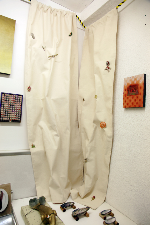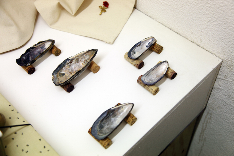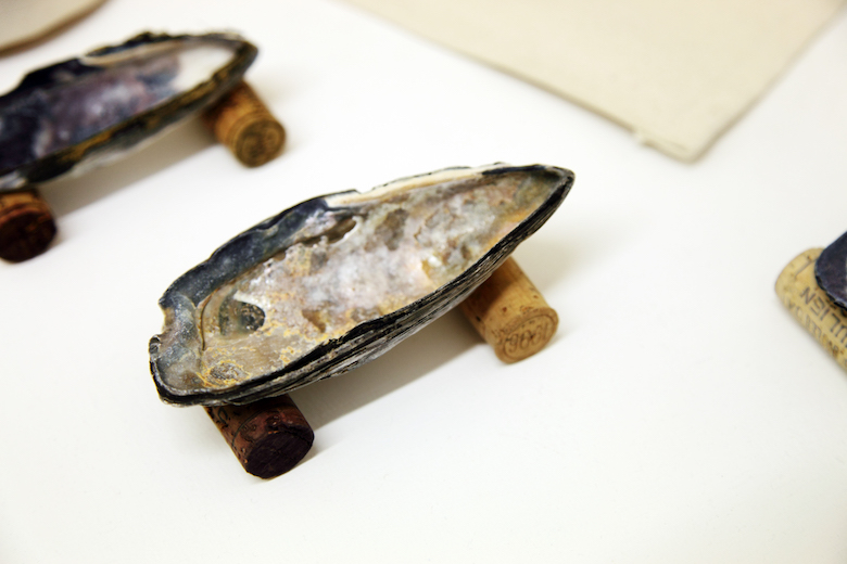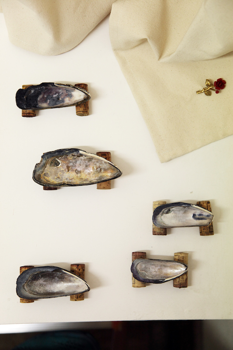 Naoki Sutter-Shudo title : Skr X5 / media : mussel shells, wine corks / size : dimension variable / year : 2017