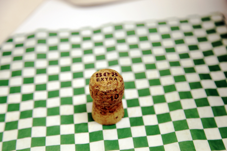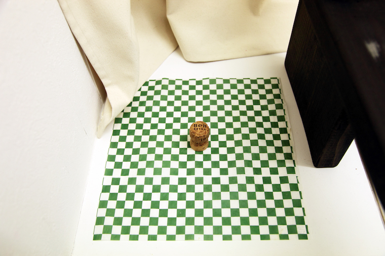 Naoki Sutter-Shudo title : Extra Bob / media : sandwich wrapping paper, champagne cork / size : 30.2 x 29.5 x 4.5 cm / year : 2017