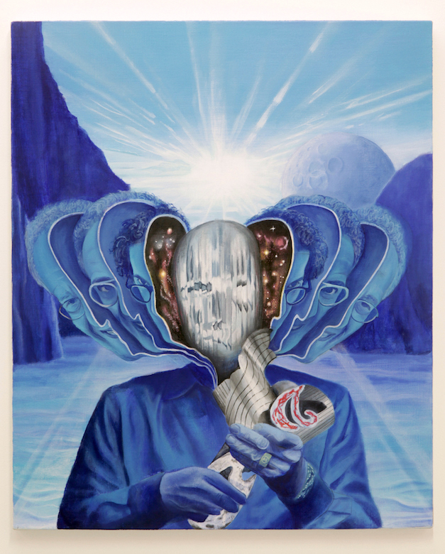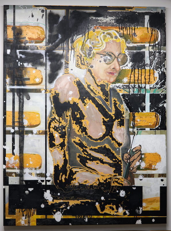 artist : Ben Schumacher title : Mrs. Doubtfire (käsesakramentsystem) media : oil on canvas, spray paint , inkjet print size :48 x 36 inc (122cm x 91cm) year : 2017