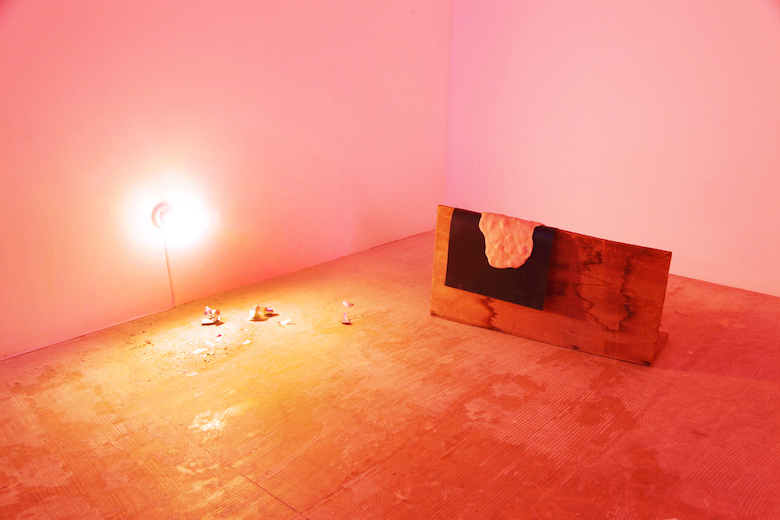 Kenji Ide title : vomit - hangin / media : plywood, gomme sheet, gummi cast / size : 43 x 14 x 23 cm / year : 2017