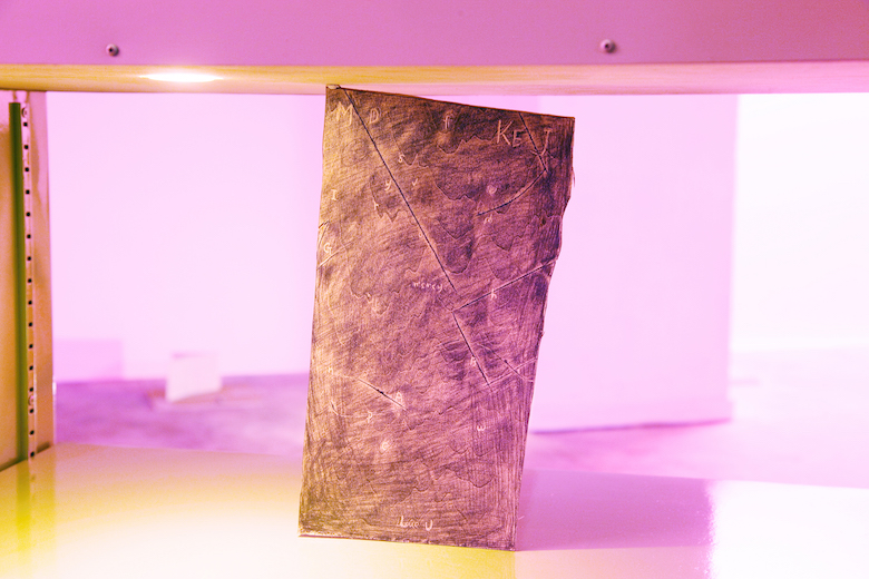 Kenji Ide title : wagon 1 - struggle (include "an old letter - J ") / media : venner, iron pan, acrylic spray color, lacquer spray color, sperm, citron, and mix media (basswood plywood, charcoal / size : 82 x 41 x 127cm ( letter size - 13 x 27) cm / year : 2017